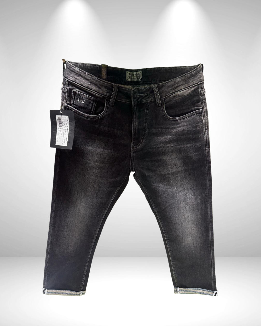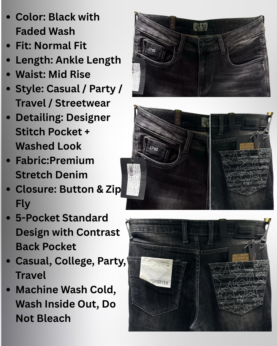 Redefine your casual wardrobe with these premium men’s ankle-length jeans, designed for a modern yet comfortable look. The jeans feature a normal fit that ensures easy movement and all-day wear. The black faded wash gives it a rugged, urban feel, while the contrasting designer back pocket adds a bold fashion statement.