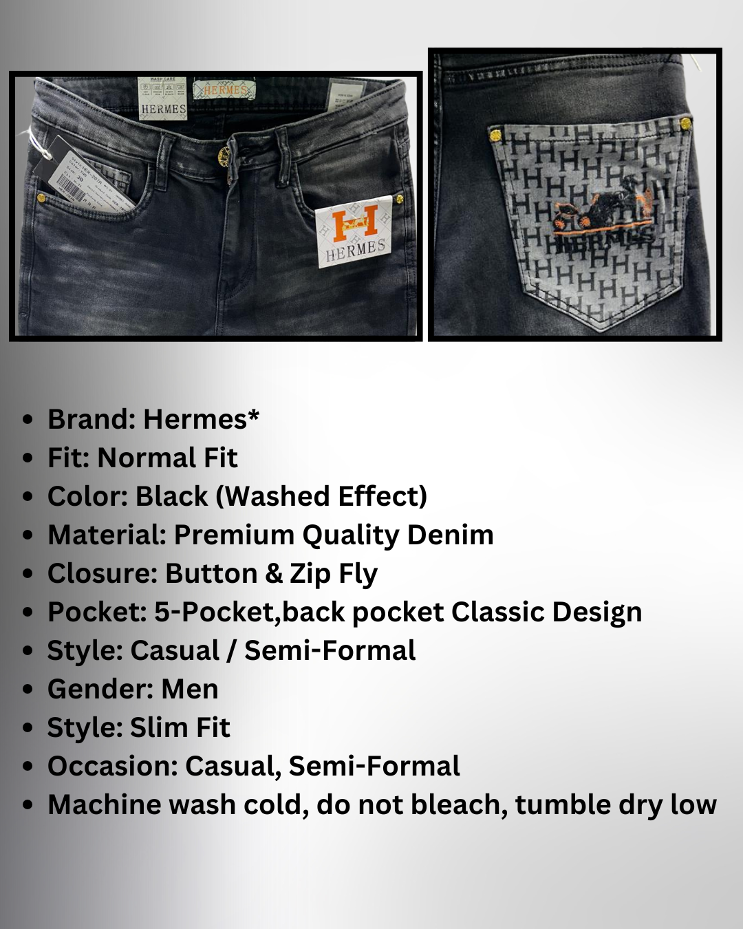 Upgrade your wardrobe with the Hermes Men’s Normal Fit Black Washed Denim Jeans, crafted with premium quality fabric to ensure both comfort and durability. Featuring a sleek faded wash finish, these jeans provide a trendy edge while maintaining timeless appeal. The slim fit design ensures a sharp silhouette, making them suitable for casual outings, office wear, or weekend gatherings.