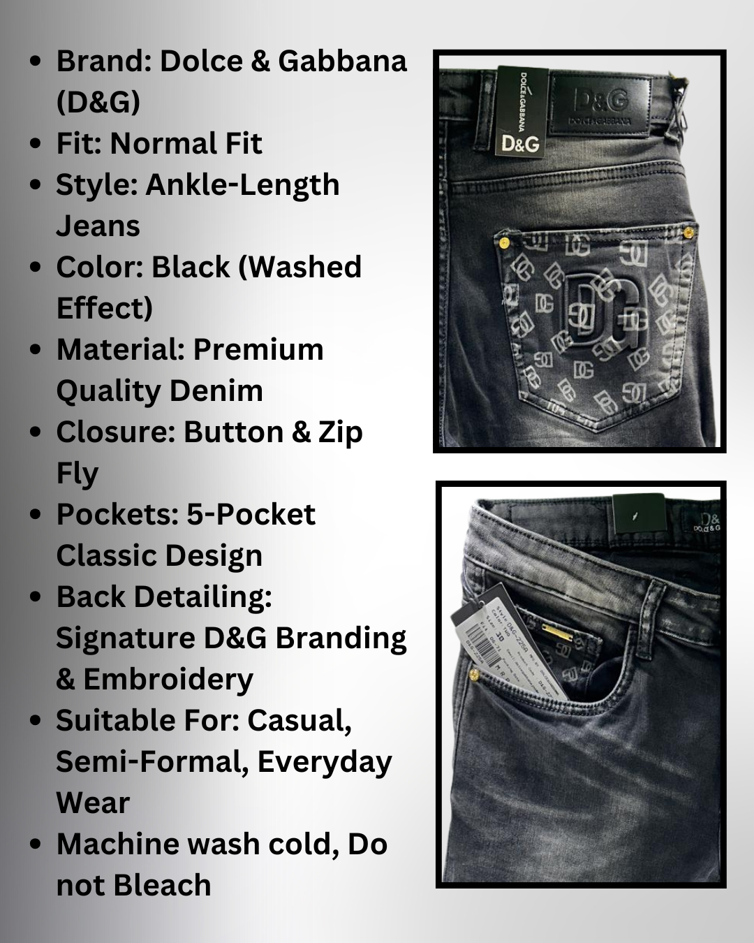 Bring luxury and comfort together with the D&G (Dolce & Gabbana) Men’s Premium Normal Fit Ankle-Length Jeans. Designed with precision tailoring, these jeans feature a sophisticated black washed finish with signature branding on the back pocket, adding a bold touch of designer style.