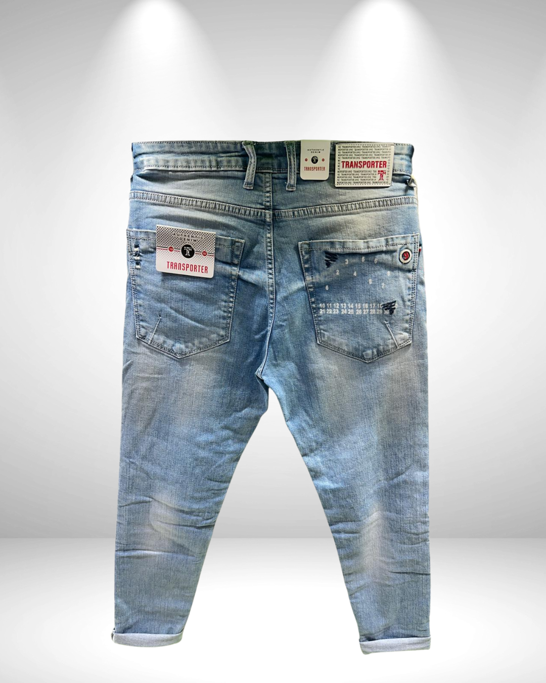 Refresh your wardrobe with the Transporter Men’s Premium Normal Fit Ankle-Length Jeans. These jeans come in a trendy light blue shade with a subtle faded wash, offering a perfect mix of comfort and modern style.