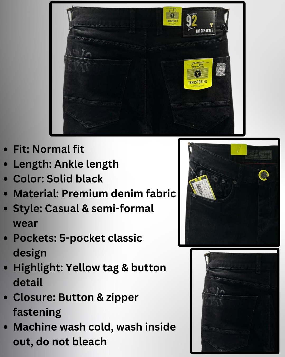 Upgrade your wardrobe with these premium men’s black jeans from the Transporter Collection, designed for those who demand both comfort and style. These jeans feature a normal fit (not slim), ensuring a relaxed and breathable wearing experience, while the ankle-length cut adds a modern, youthful touch.