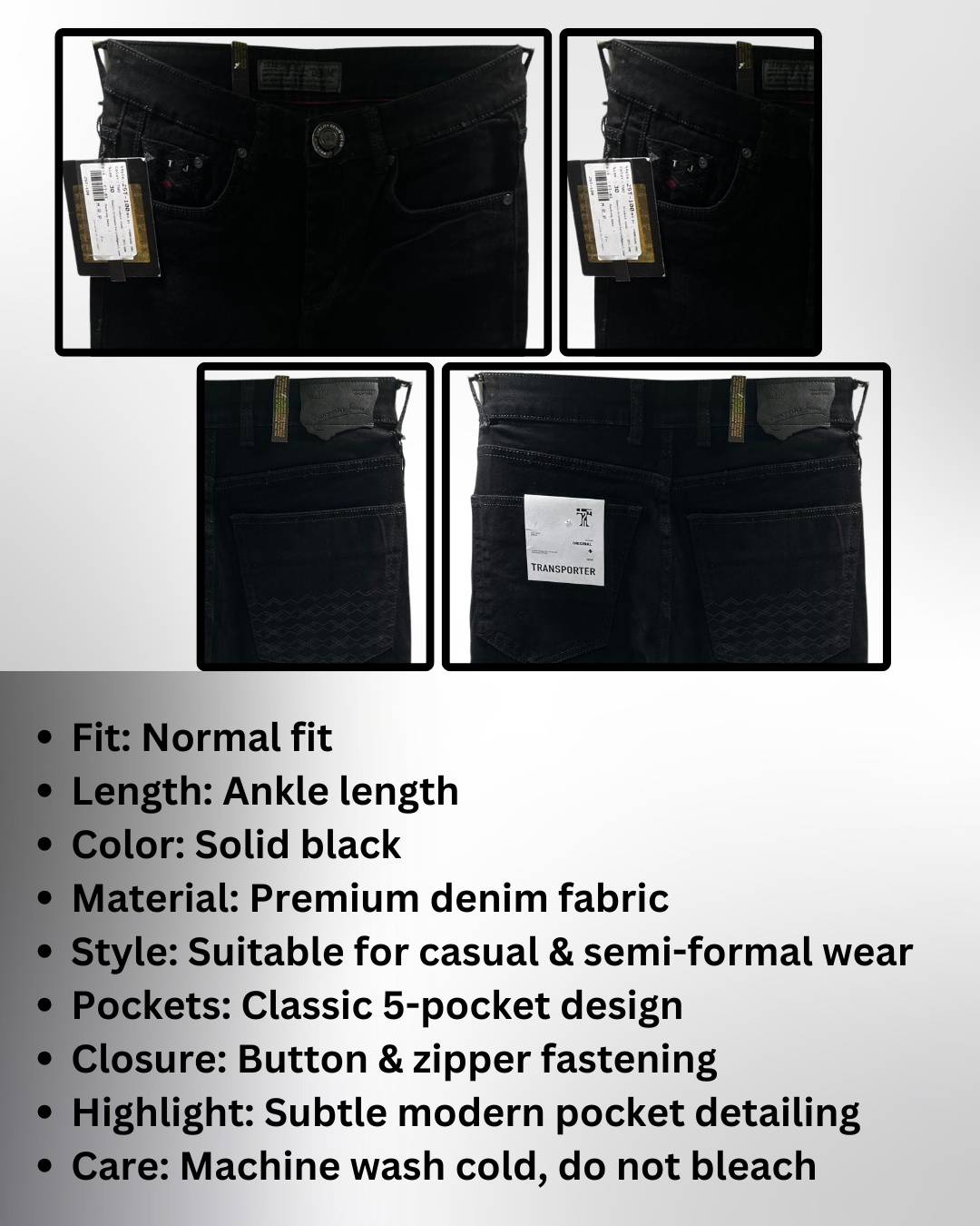Upgrade your wardrobe with these premium men’s black jeans – a perfect blend of comfort, durability, and modern style. Tailored in a normal fit with an ankle-length design, these jeans are versatile enough for both casual and semi-formal occasions.