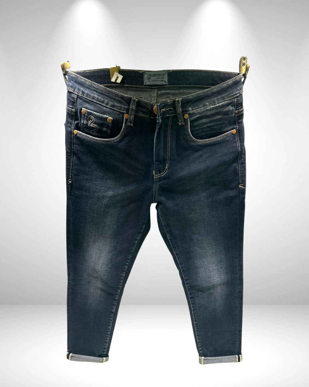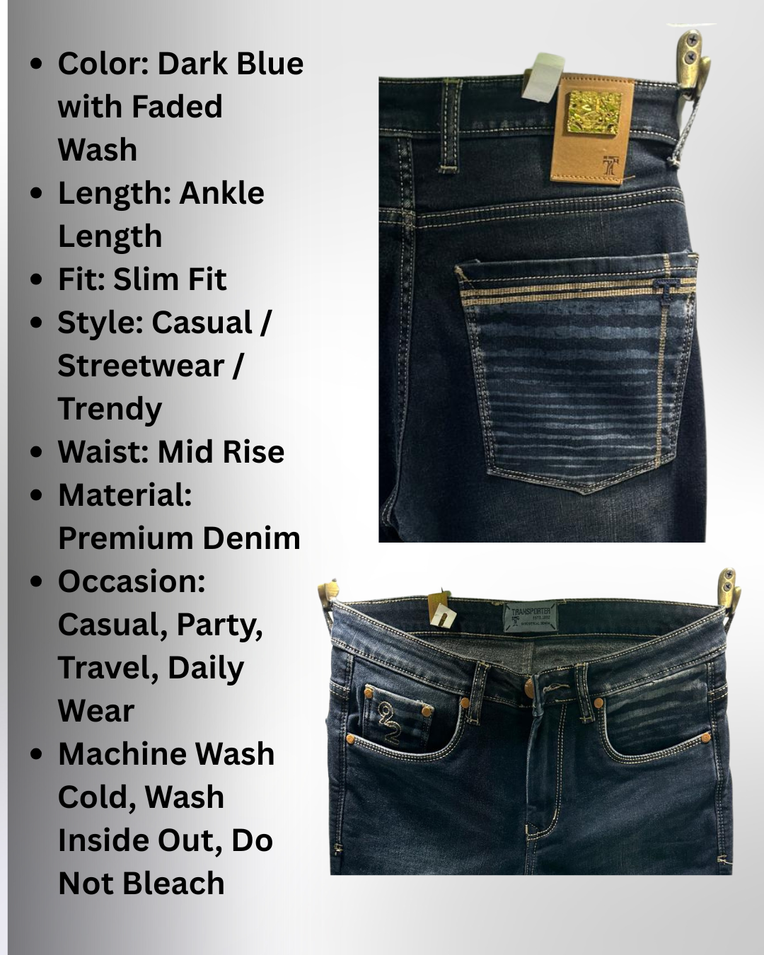 Elevate your wardrobe with these premium dark blue slim fit jeans for men, designed for both comfort and fashion. The ankle-length cut gives a modern and sharp silhouette, while the faded wash effect adds a touch of rugged charm.