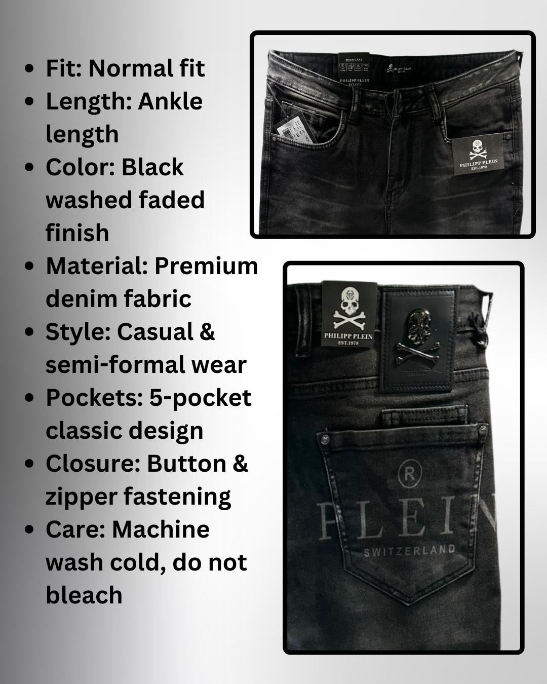 The Philipp Plein-inspired skull branding and faded wash effect give these jeans a unique urban vibe. Featuring a classic 5-pocket design, button & zipper closure, and ankle-length cut, these jeans are perfect for pairing with sneakers or casual shoes. Ideal for both casual outings and semi-formal looks, this versatile pair is a must-have in every man’s wardrobe.